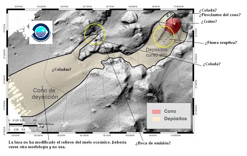This wonderful bathymetric profile of the IEO volcano la Restinga in a manner much more apreiable and like this can be seen at the edge of the ravine, but there is something else... emission feathers... and is also of the cone, to the right of the cone it shows another feather of an emission, which may be the beginning of another mouth and starts dating volcanic material there to form another Cone, this win cone height more quickly to be flatter and have the current Cone in an area holding materials not outstanding rodarian down so easily. I conclude with something important, and is that more information be public but we come to see the reality of what is happening. (Henry