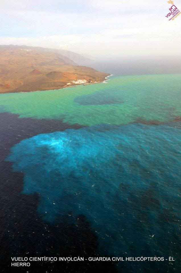 - INVOLCAN has just published an incredible set of today's photographs taken from the Guardia Civil helicopter flight, showing, as we commented today, a vivid blue stain, formed by gas release, with CO2 bubbles, and a bigger green stain, formed by nitrogen and sulfur gases, that lays inside La Restinga port.