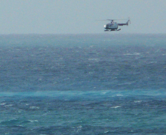 - Joke Volta told us the Guardia Civil helicopter was inspecting a much larger area than usual and sent us a photograph of the moment. The middle of the stain has a blue colour that can be clearly seen on the eruption webcam now. Click on image to enlarge.